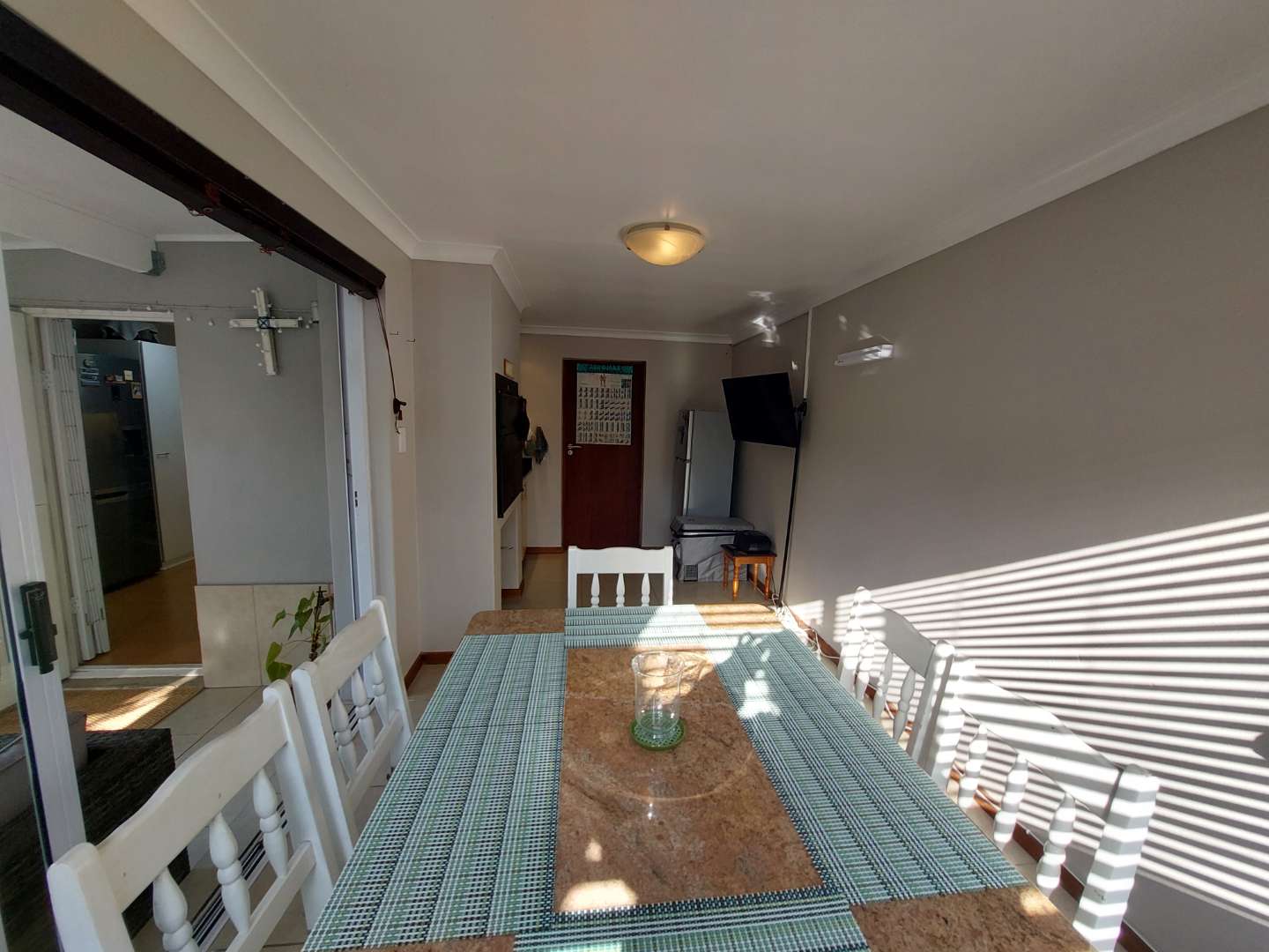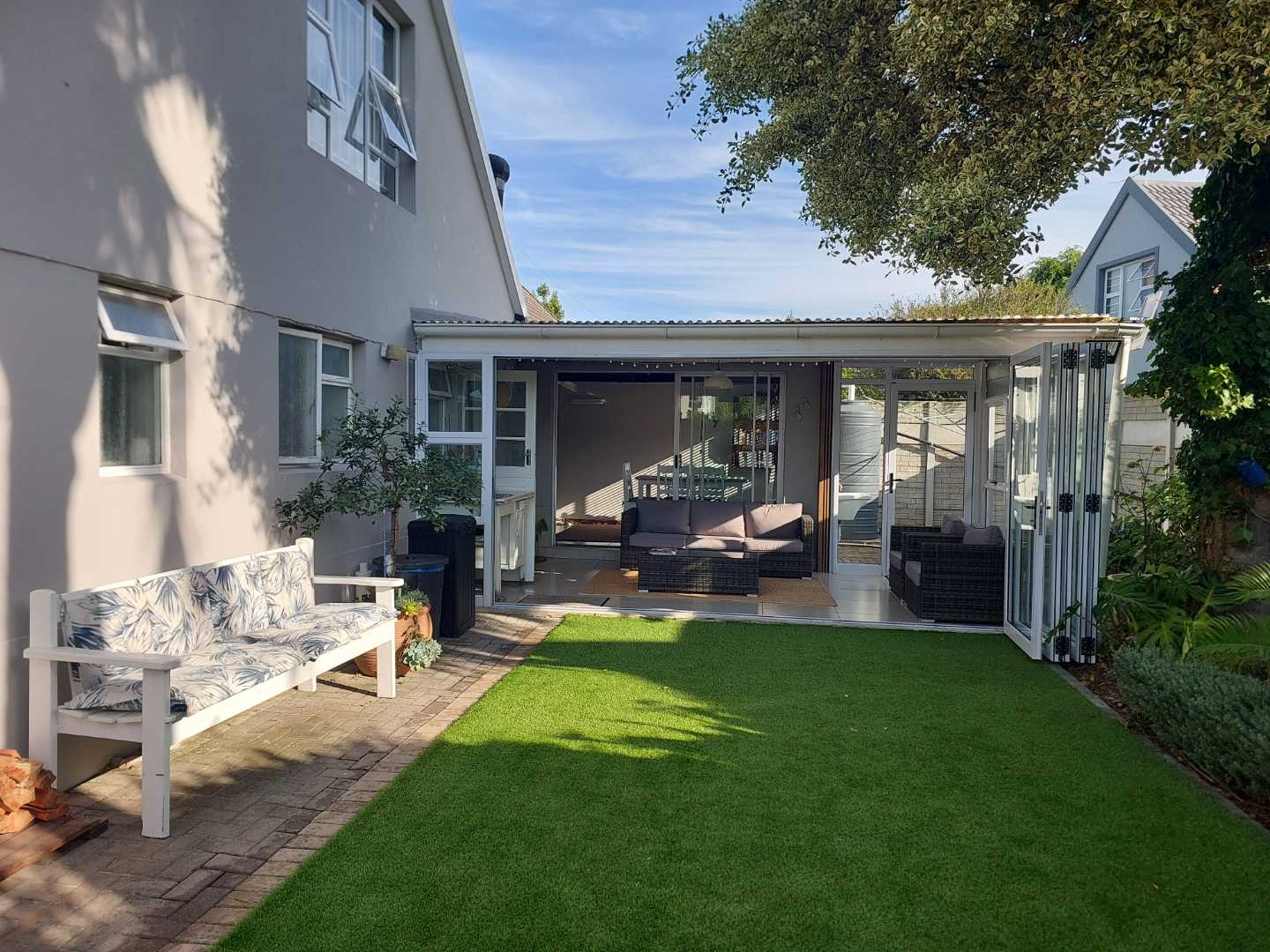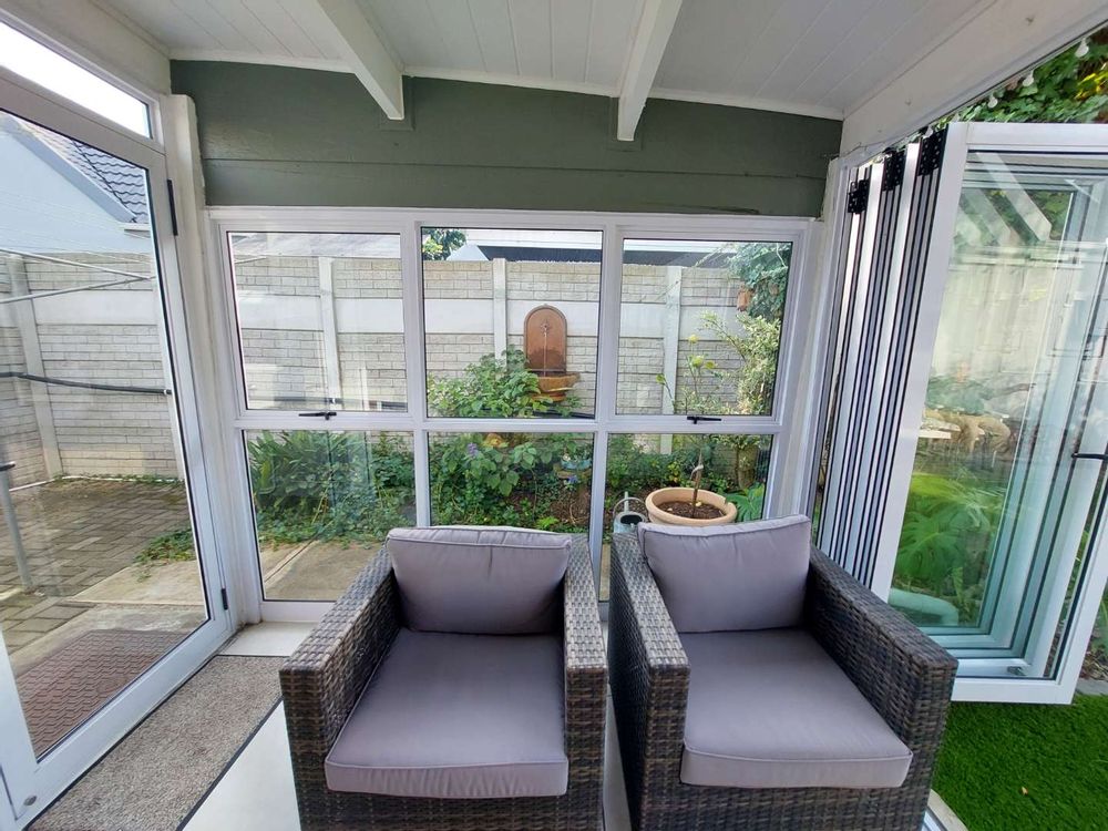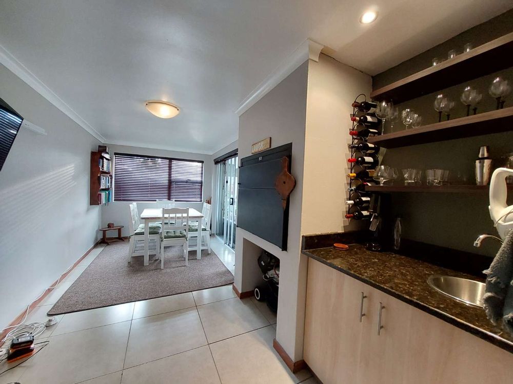 A modern security system is also in place, which can be fully connected to your Wi-Fi for convenient remote monitoring. There is ample additional storage on the top floor. The laundry area is conveniently located, offering easy access and practical workflow for everyday living. Aluminium windows. The home features a charming indoor braai area with a lovely veranda that can be fully enclosed with stacking doors that opens onto the garden area that invites the warmth of sunny days.