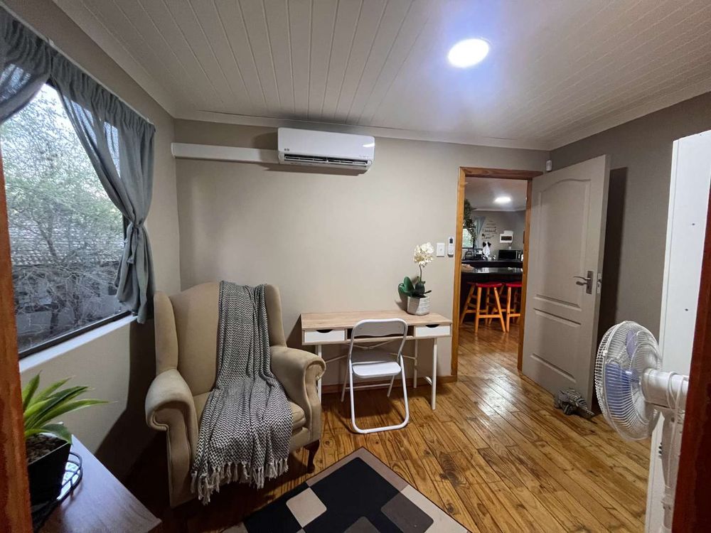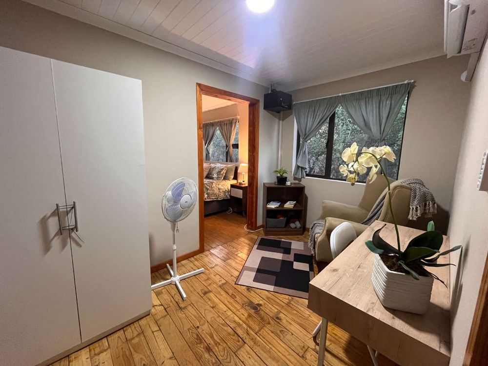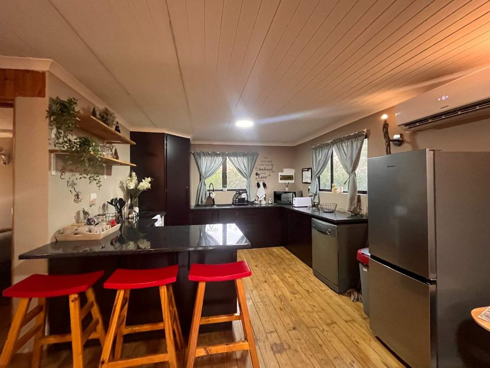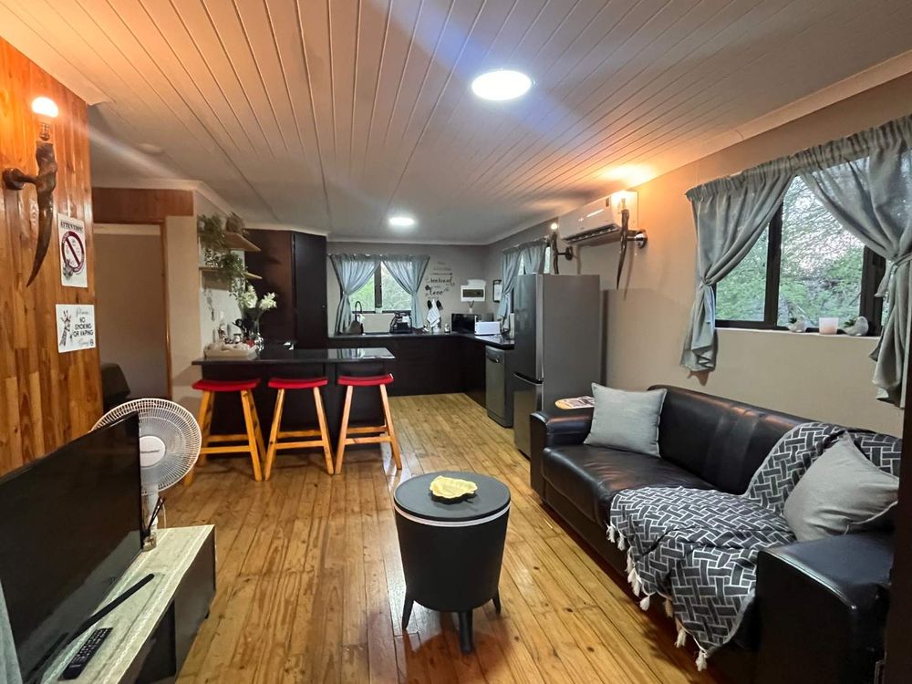 The home comprises 2-and-a-half bedrooms and 1 bathroom with a shower. The newly fitted open-plan kitchen features a gas stove and oven, modern sink with mixer, corner pantry, and a spacious semi-island with ample seating and generous cupboard space—ideal for easy entertaining and everyday living. The living and dining areas open onto an upstairs balcony, providing a front-row seat to the sights and sounds of the surrounding bush.