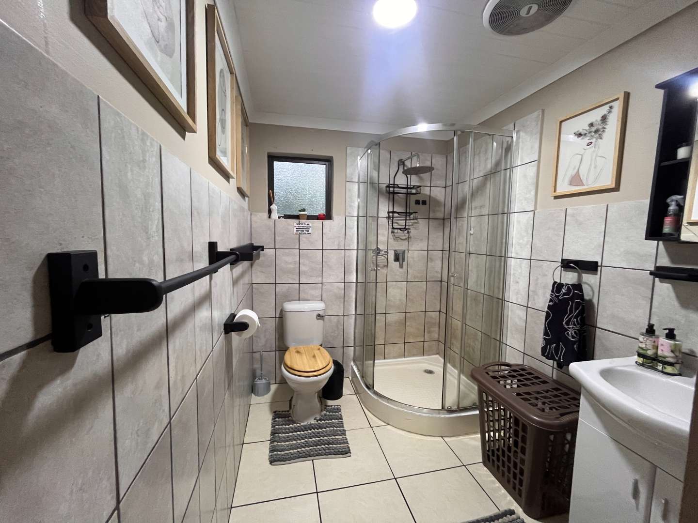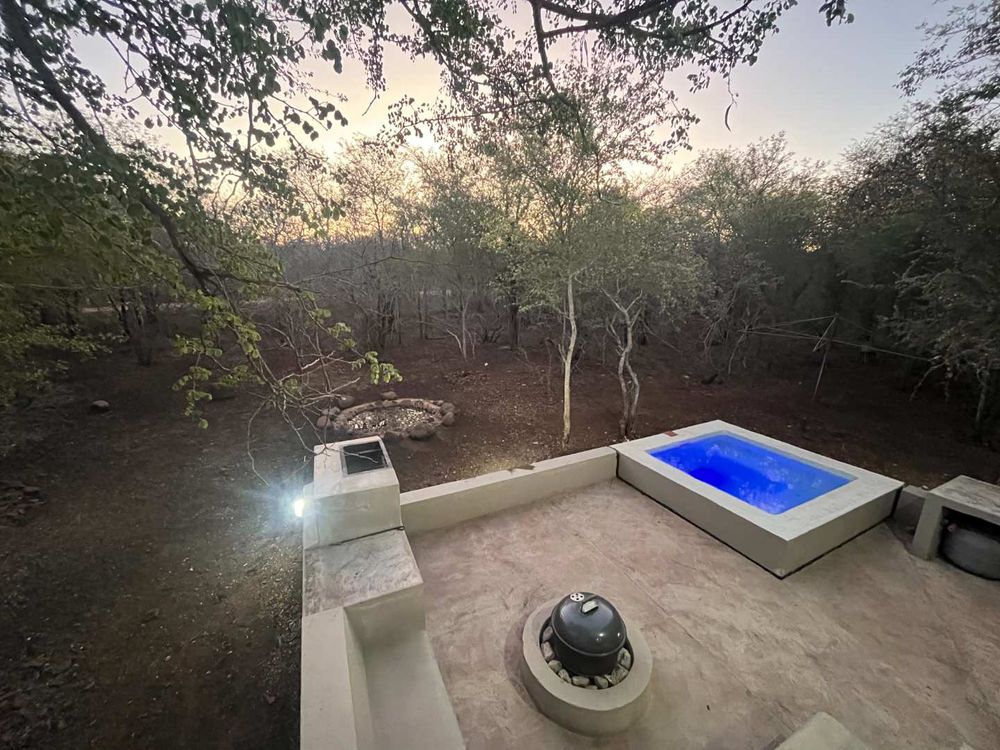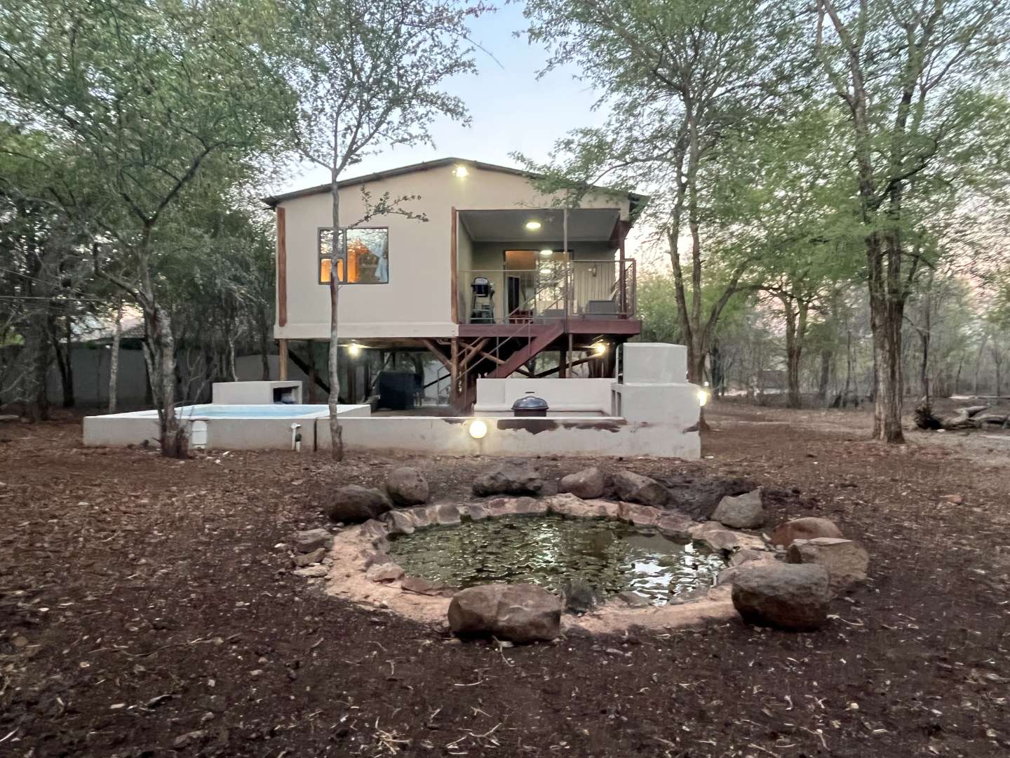 Outdoor features include a splash pool and fire pit, perfect for starlit evenings while enjoying visits from free-roaming wildlife. The space beneath the house offers excellent potential for entertaining or additional storage. Additional features include a fitted gas geyser and two air-conditioners for year-round comfort.
